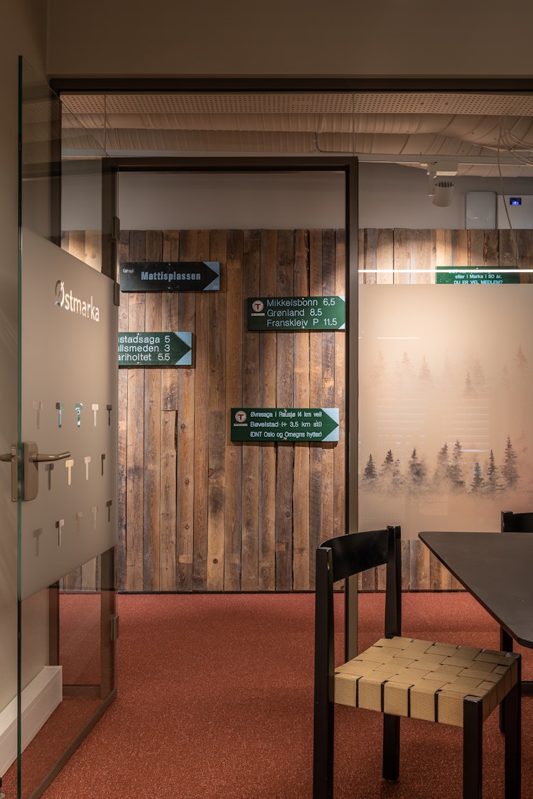 Bygget er et av Oslos eldst bevarte, med opprinnelse tilbake til 1700-tallet. Med hvert lag vi fjernet, ble bygningens historiske sjel tydeligere. Bak overflaten skjulte det seg teglstein, bindingsverk, rupanel, gammelt gulv, søyler og dragere i tre fra gårdens opprinnelse. Disse elementene var kjærkomne bidrag i å få frem både byggets og DNT Oslo og Omegns lange historie og sterke identitet. Vi ønsket å bruke disse funnene til å fremheve DNT Oslo & Omegns stolte tradisjon i regionen. Med deres arkiv av bilder, hytter, kart og gjenstander, kunne vi integrere historiefortellingen i interiøret.